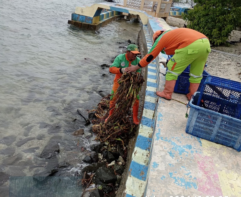 Petugas pesisir pantai dari Suku Dinas Lingkungan Hidup (Sudin LH) Kepulauan Seribu, membersihkan sampah kiriman yang ada di tepi Pulau Sabira, Kel ..