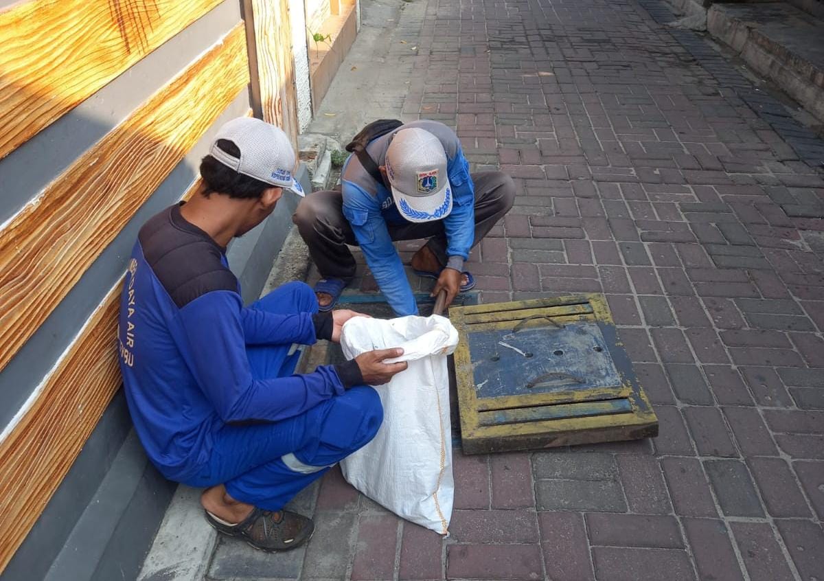 Petugas Suku Dinas Sumber Daya Air (Sudin SDA) Kepulauan Seribu, membersihkan 30 titik sumur resapan di RW 02, Kelurahan Pulau Tidung, Kecamatan Ke ..