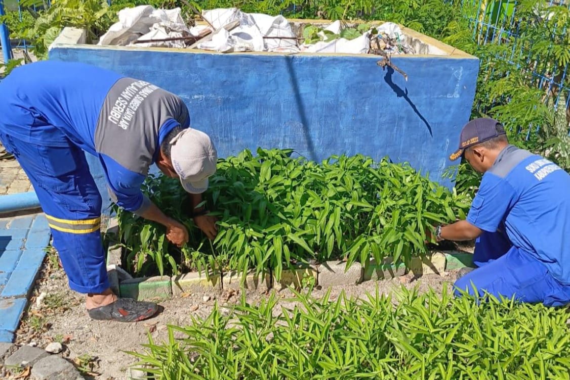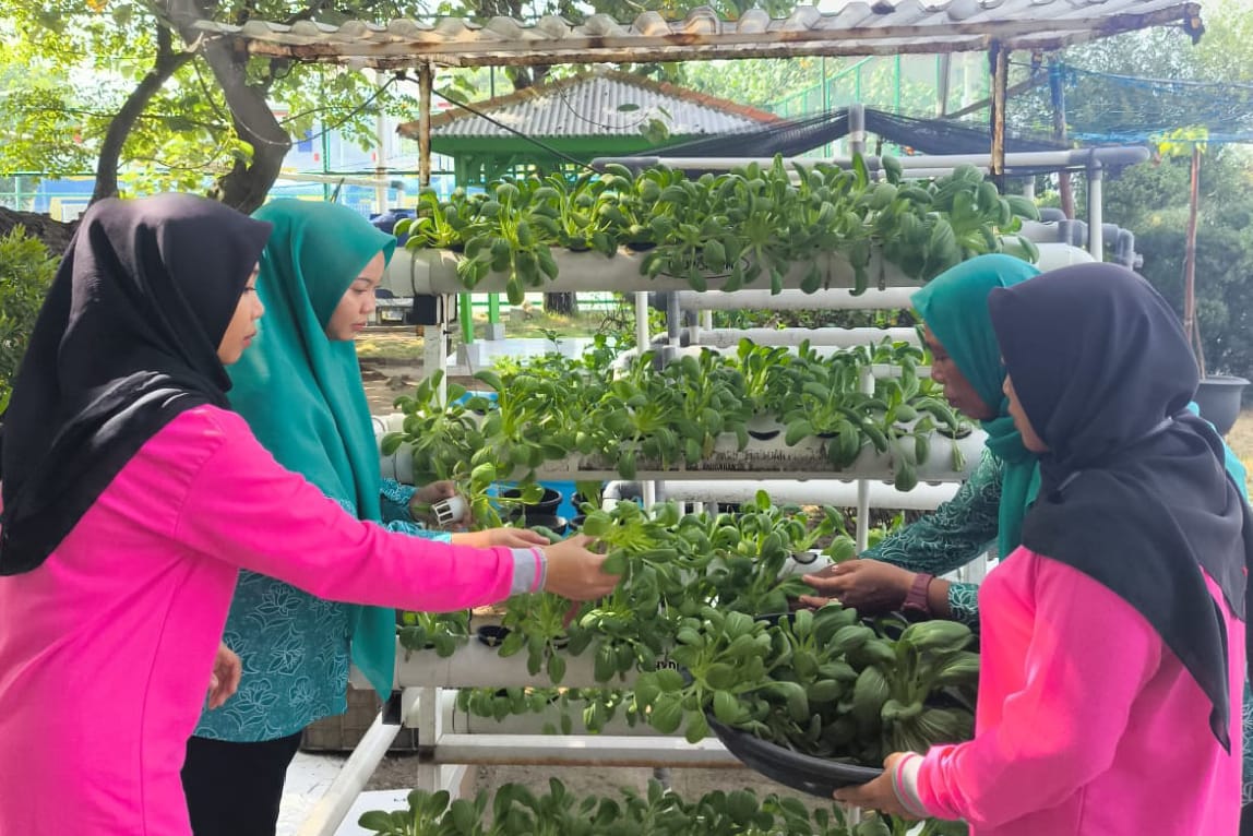 Pengelola RPTRA Amiterdam bersama kader PKK Kelurahan Pulau Untung Jawa, Kecamatan Kepulauan Seribu Selatan panen sayuran pakcoy.