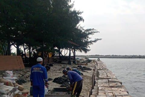 Petugas Suku Dinas Sumber Daya Air (Sudin SDA) Kepulauan Seribu, membangun tanggul dengan kubus masif di depan SDN Pulau Untung Jawa 01 Pagi, Kelur ..