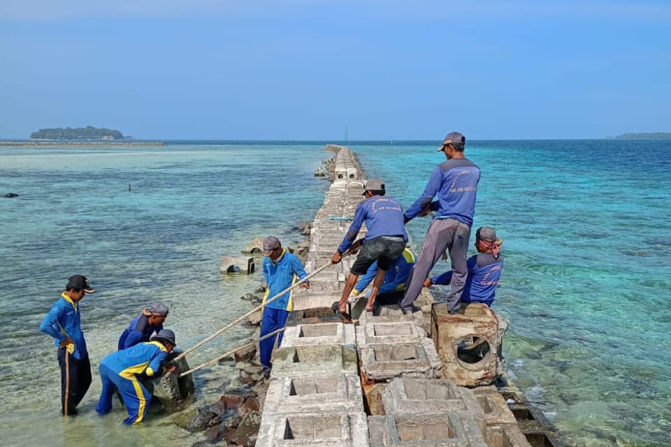 Suku Dinas Sumber Daya Air (Sudin SDA) Kepulauan Seribu, memastikan, tahapan pembangunan breakwater atau tanggul pemecah ombak, telah dilakukan ber ..
