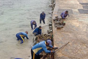 Petugas Suku Dinas Sumber Daya Air (Sudin SDA) Kepulauan Seribu, memperbaiki bronjong belah batu di Dermaga Utama RT 01/01, Kelurahan Pulau Untung ..