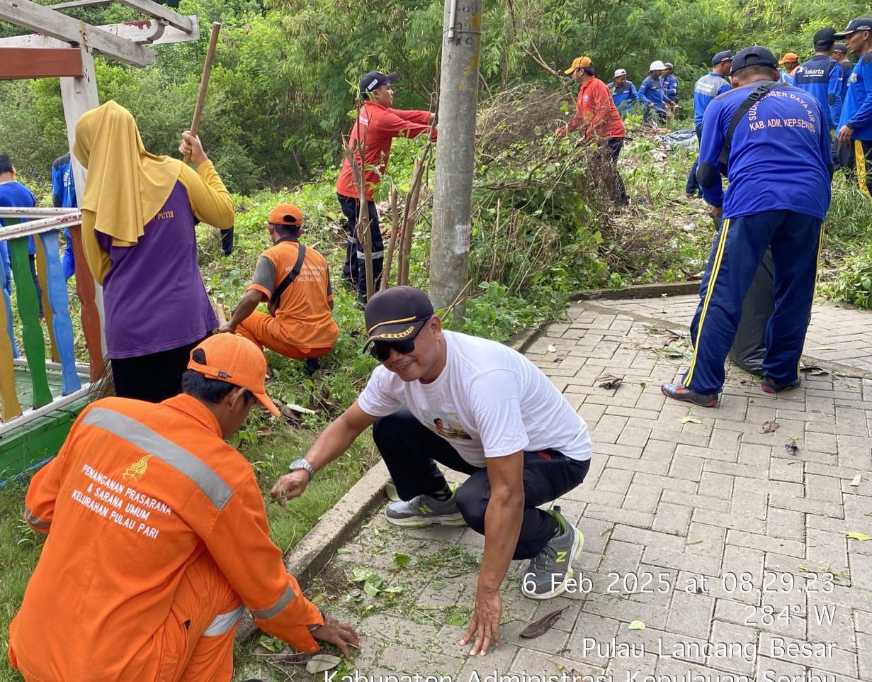 Ratusan petugas gabungan bersama warga melakukan kerja bakti membersihkan lingkungan RW 03 Pulau Lancang, Kelurahan Pulau Pari, Kecamatan Kepulauan ..