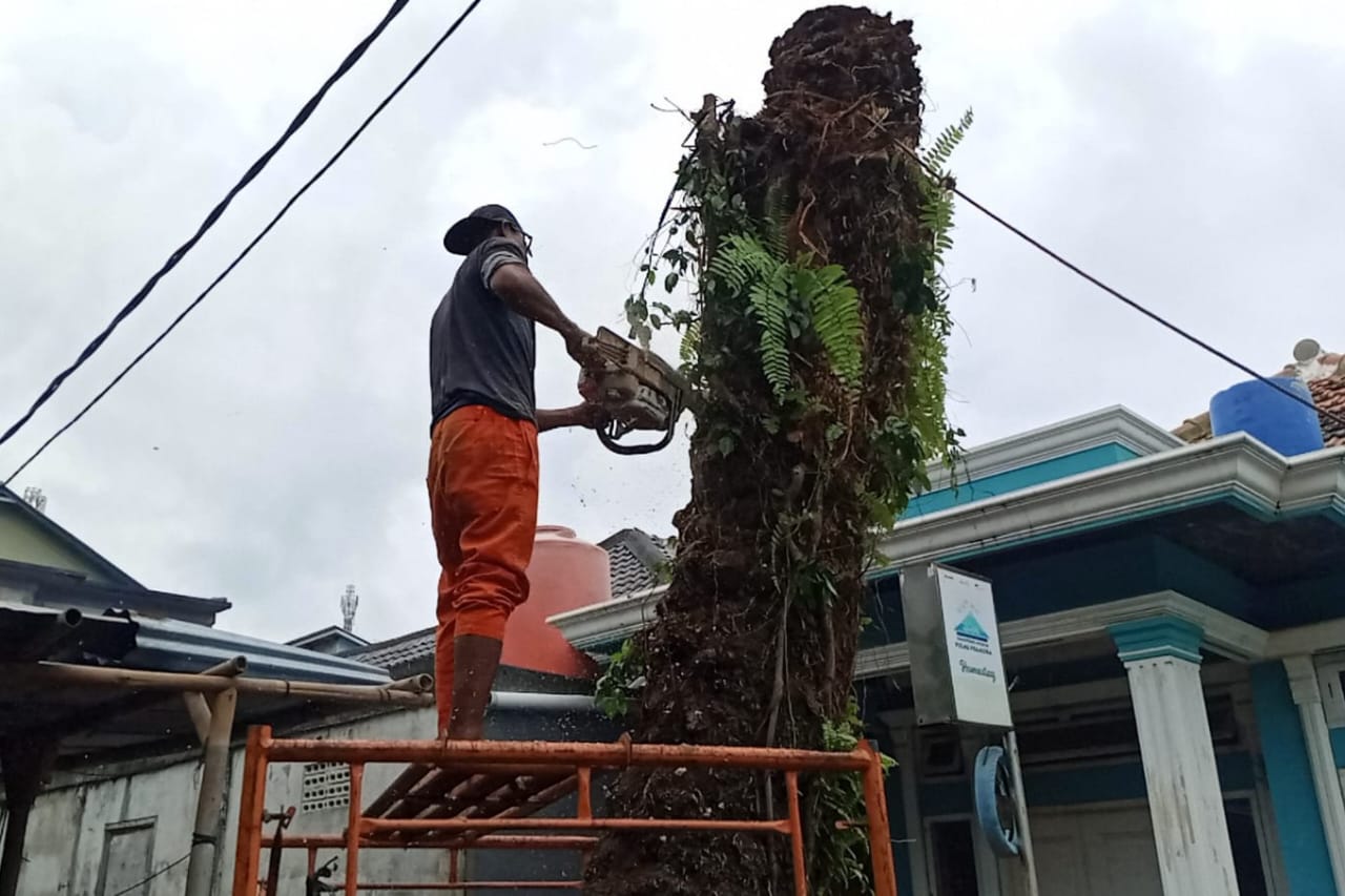 Sebanyak lima belas petugas PPSU Kelurahan Pulau Panggang, Kecamatan Kepulauan Seribu Utara menebang pohon kurma, di Pulau Pramuka.