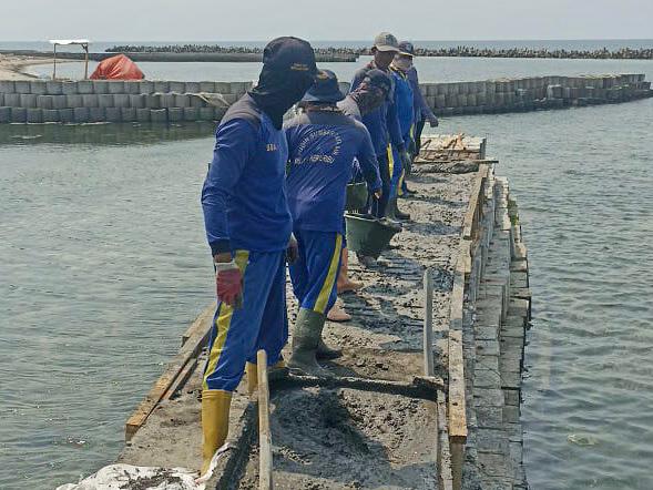Proses penguatan tanggul pembatas di sisi timur Pulau Untung Jawa, RT 03/03, Kelurahan Pulau Untung Jawa, Kecamatan Kepulauan Seribu Selatan, yang ..
