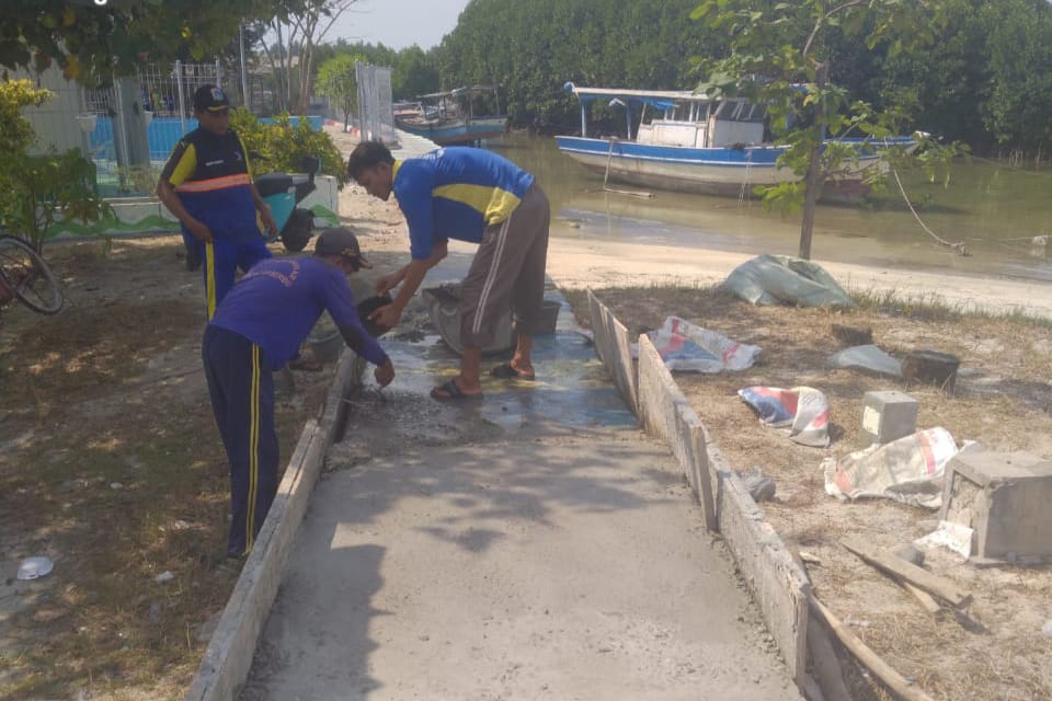 Petugas Suku Dinas Sumber Daya Air (Sudin SDA) Kepulauan Seribu melakukan penguatan tanggul di sisi timur Pulau Panggang, Kepulauan Seribu Utara. ..