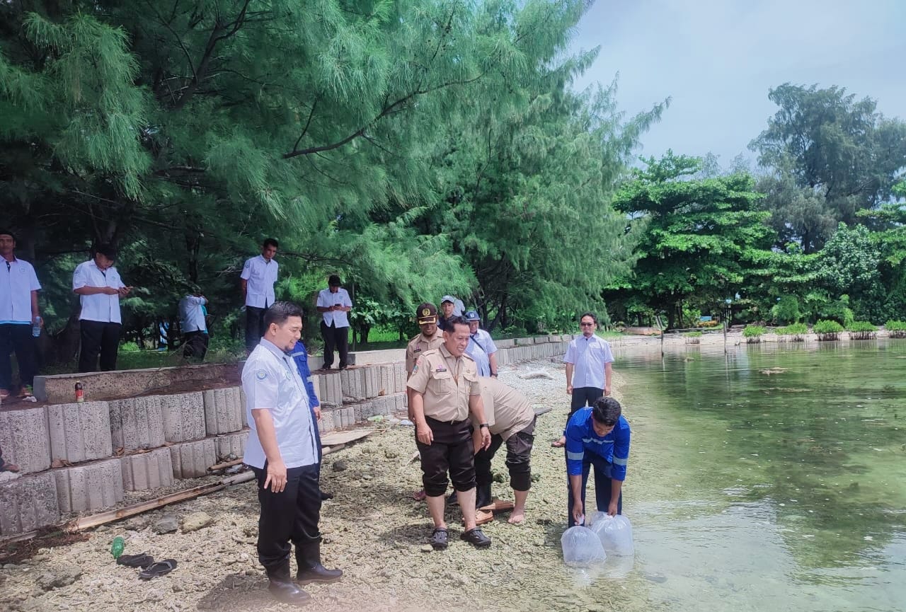 Suku Dinas Ketahanan Pangan, Kelautan, dan Pertanian (Sudin KPKP) Kepulauan Seribu melakukan restocking 300 kuda laut di peraira ..