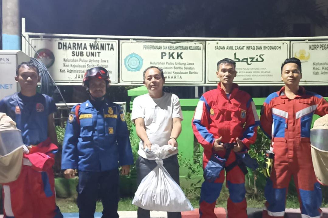 Petugas Suku Dinas Penanggulangan Kebakaran dan Penyelamatan (Sudin Gulkarmat) Jakarta Utara dan Kepulauan Seribu, berhasil evakuasi sarang ta ..