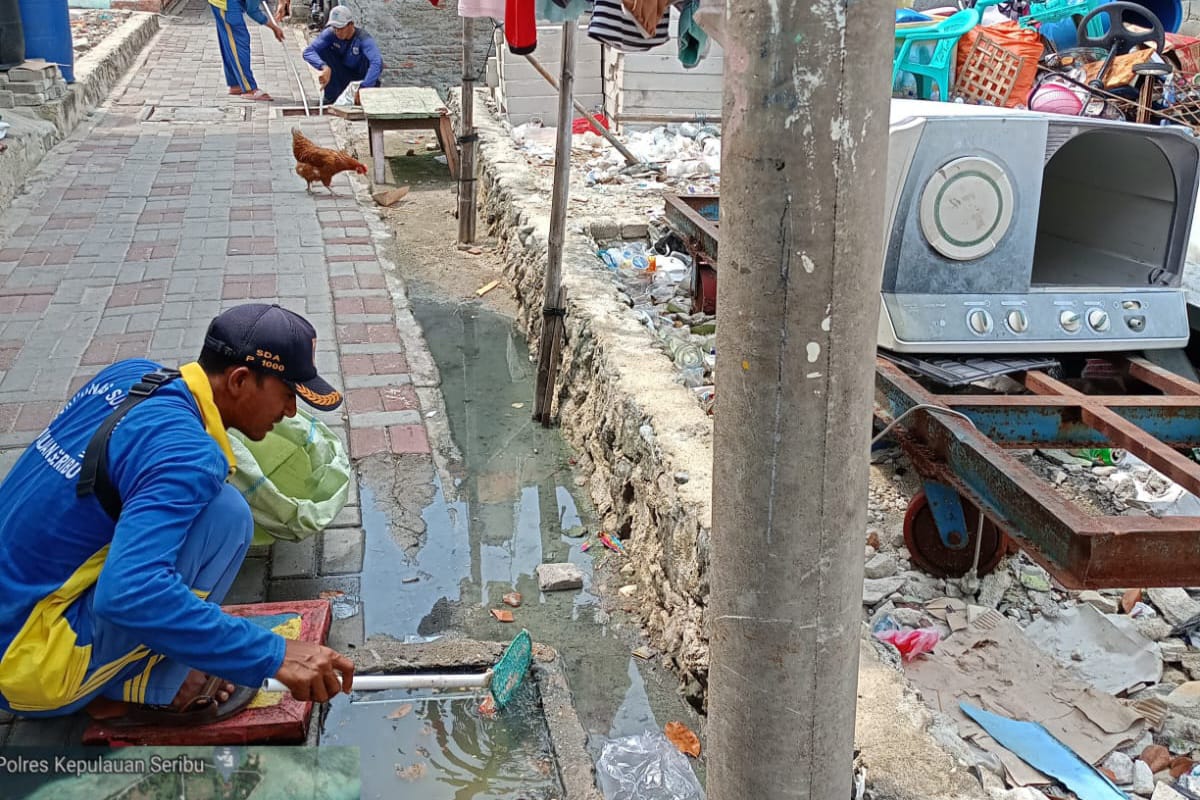 Petugas Suku Dinas Sumber Daya Air (Sudin SDA) Kepulauan Seribu, menguras 20 titik saluran air di Kelurahan Pulau Panggang, Kecamatan Kepulauan Ser ..
