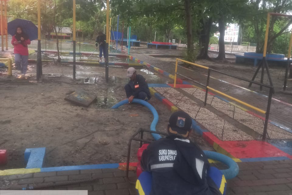 Petugas Suku Dinas Sumber Daya Air (Sudin SDA) Kepulauan Seribu, menangani genangan air di Ruang Publik Terpadu Ramah Anak (RPTRA) Nyiur Melambai P ..