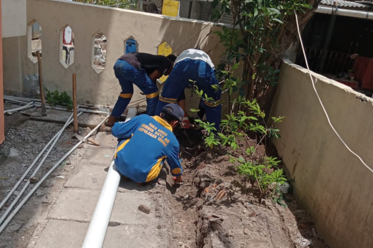 Petugas Suku Dinas Sumber Daya Air (Sudin SDA) Kabupaten Kepulauan Seribu, melakukan penambahan saluran air di Pulau Panggang, Kepulauan Seribu Uta ..