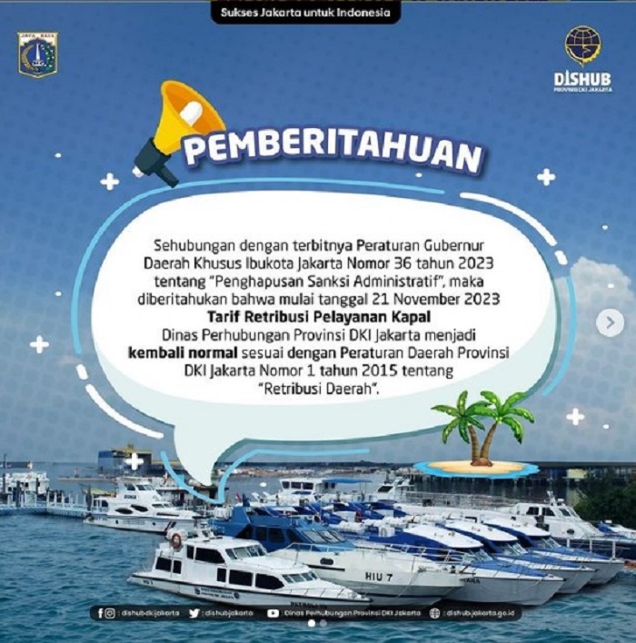 Dinas Perhubungan (Dishub) DKI Jakarta telah menetapkan tarif retribusi kapal pelayanan ke wilayah Kepulauan Seribu, dengan tarif normal.
