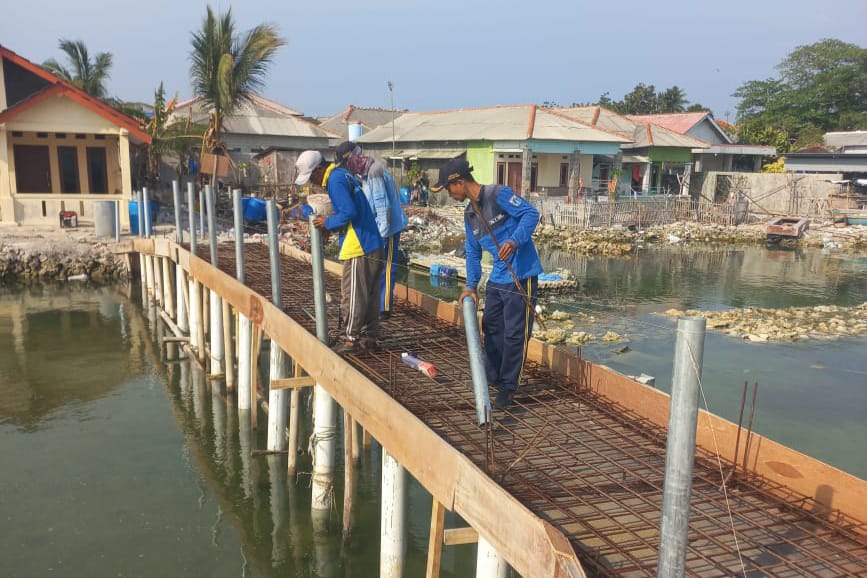 Petugas Suku Dinas Sumber Daya Air (Sudin SDA) Kepulauan Seribu, membangun tanggul penghubung di Pulau Harapan, Kepulauan Seribu Utara.