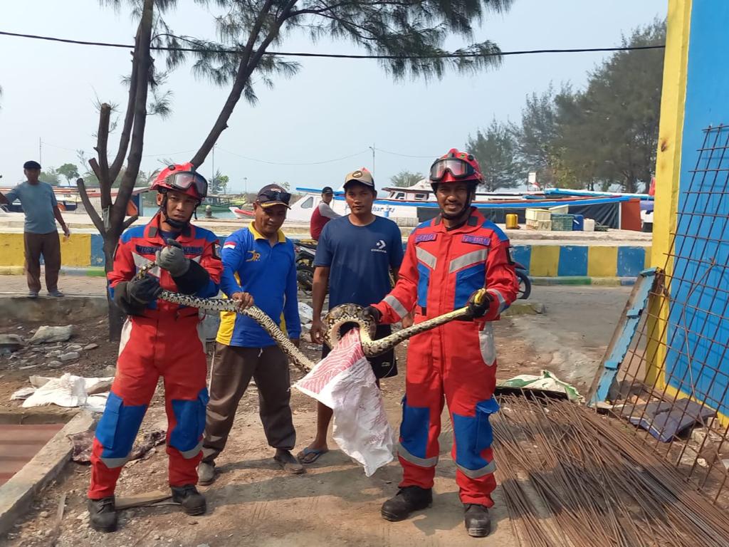 Petugas Suku Dinas Penanggulangan Kebakaran dan Penyelamatan (Sudin Gulkarmat) Jakarta Utara dan Kepulauan Seribu, berhasil mengevakuasi seekor ula ..