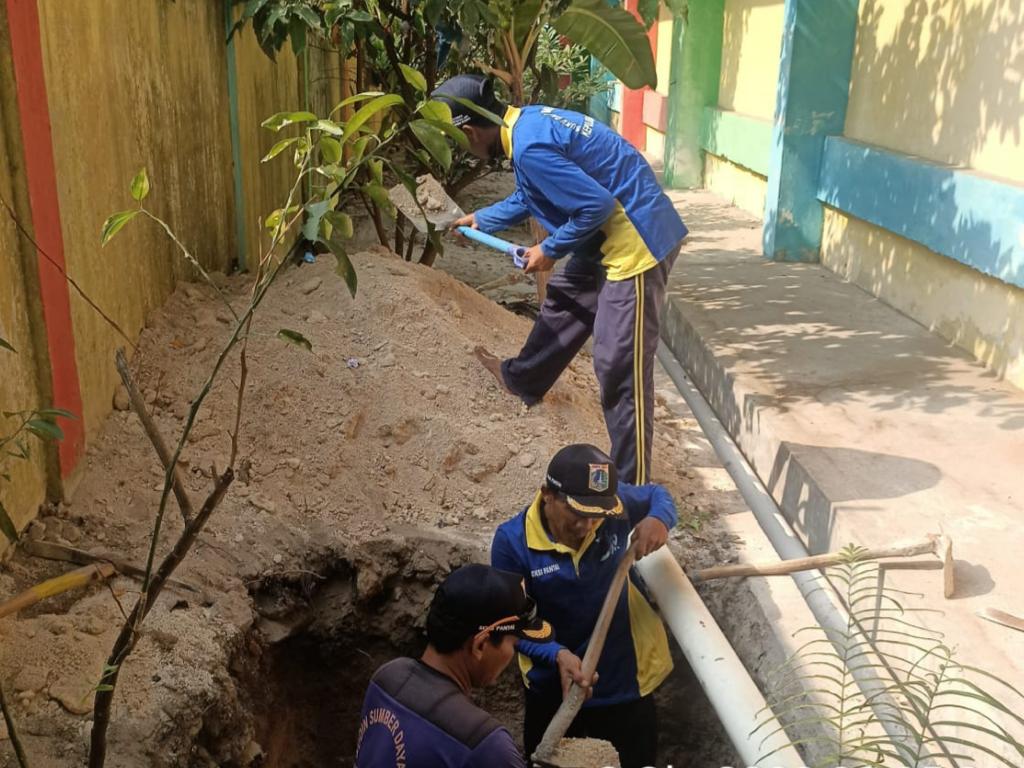 Petugas Suku Dinas Sumber Daya Air (Sudin SDA) Kepulauan Seribu, membangun satu titik sumur resapan di area Gedung SDN 02 Pagi, Pulau Kelapa, Kepul ..