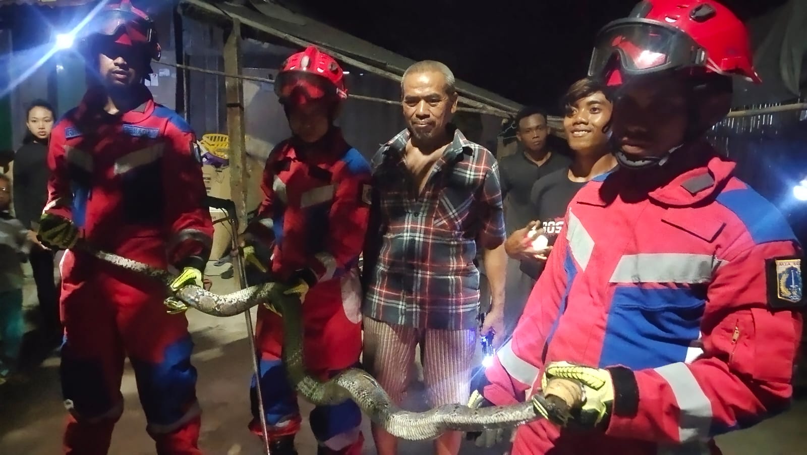 Petugas Suku Dinas Penanggulangan Kebakaran dan Penyelamatan (Sudin Gulkarmat) Jakarta Utara dan Kepulauan Seribu, berhasil mengevakuasi ular sanca ..