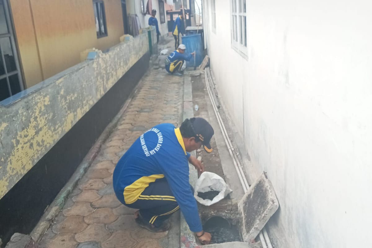 Petugas Suku Dinas Sumber Daya Air (Sudin SDA) Kepulauan Seribu, melakukan pengurasan bak kontrol di Pulau Panggang, Kepulauan Seribu Utara.