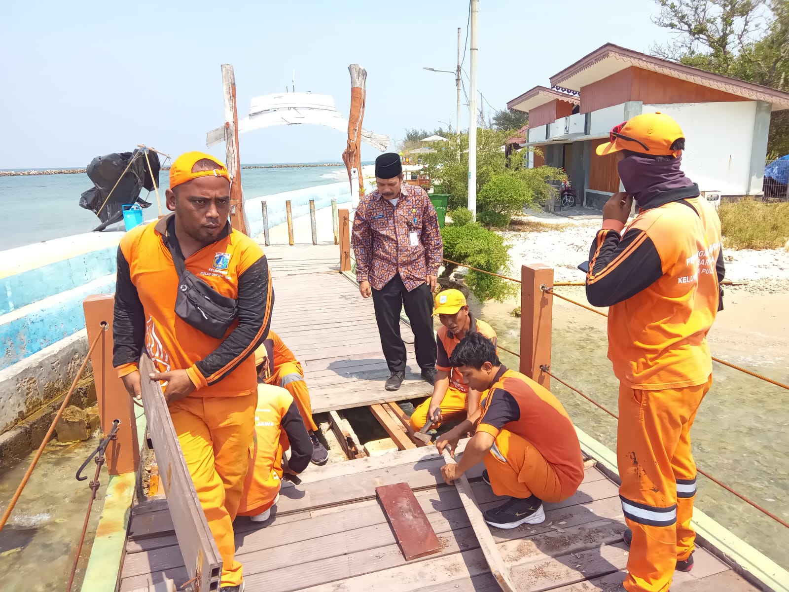 Petugas Penanganan Prasarana dan Sarana Umum (PPSU) Kelurahan Pulau Untung Jawa, Kecamatan Kepulauan Seribu Selatan memperbaiki lantai Jembat ..