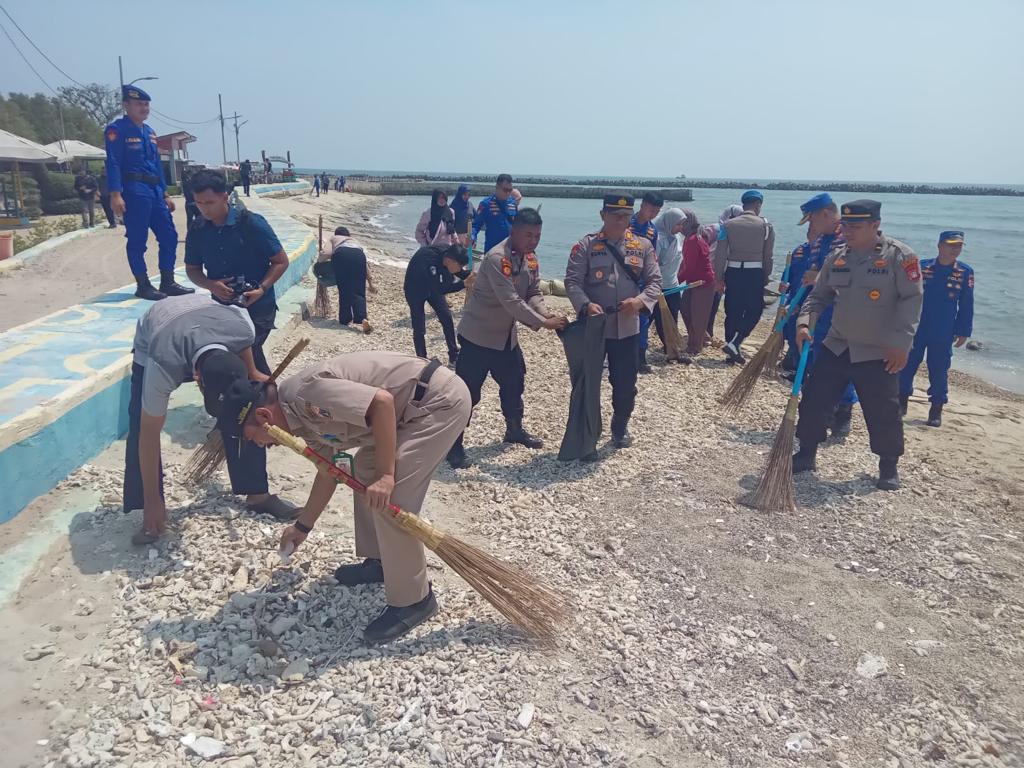 Petugas gabungan Kelurahan Pulau Untung Jawa, Kecamatan Kepulauan Seribu Selatan, menyelenggarakan kerja bakti di area Pantai Sakura.