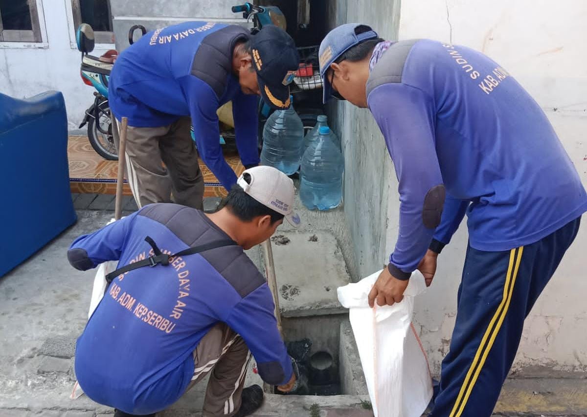 Petugas Suku Dinas Sumber Daya Air (Sudin SDA) Kepulauan Seribu, berhasil mengangkut 102 karung berisi lumpur dan sampah dari saluran air di RW 01, ..