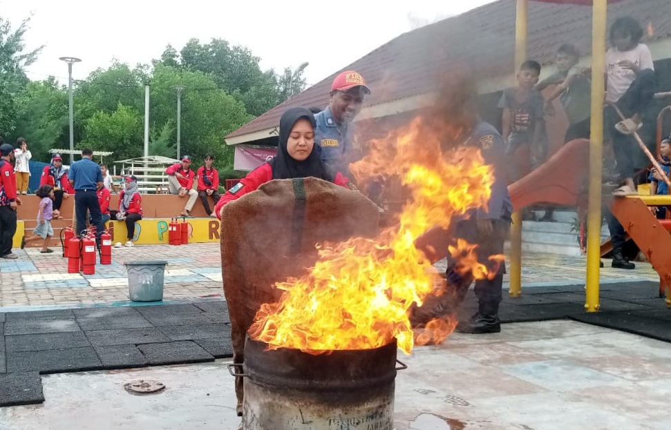 Petugas Suku Dinas Penanggulangan Kebakaran dan Penyelamatan (Sudin Gulkarmat) Jakarta Utara dan Kepulauan Seribu, mengadakan sosialisasi pencegaha ..