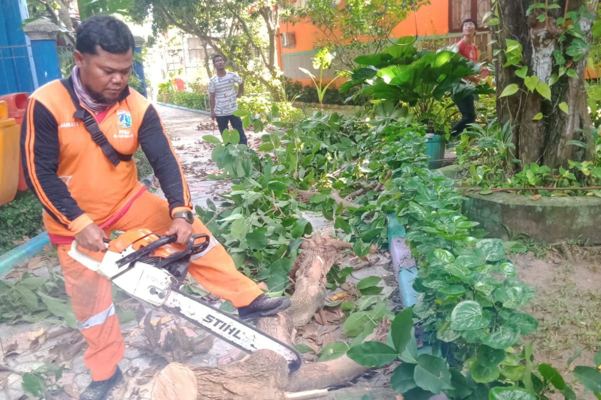 Kelurahan Pulau Panggang, Kecamatan Kepulauan Seribu Utara mengerahkan 17 petugas PPSU, untuk memangkas pohon di rumah dinas Bupati Kepulauan Serib ..