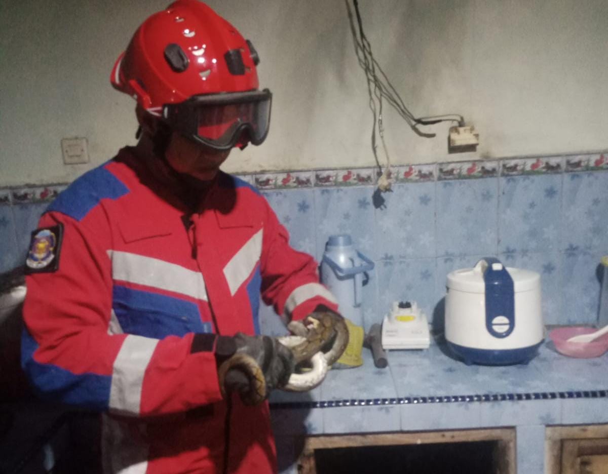 Petugas Suku Dinas Penanggulangan Kebakaran dan Penyelamatan (Gulkarmat) Jakarta Utara dan Kepulauan Seribu berhasil mengevakuasi ular sanca sepanj ..