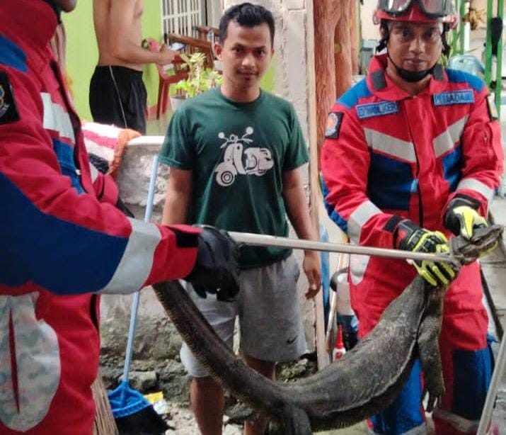 Petugas Suku Dinas Penanggulangan Kebakaran dan Penyelamatan (Sudin Gulkarmat) Jakarta Utara dan Kepulauan Seribu, berhasil mengevakuasi biawak ber ..