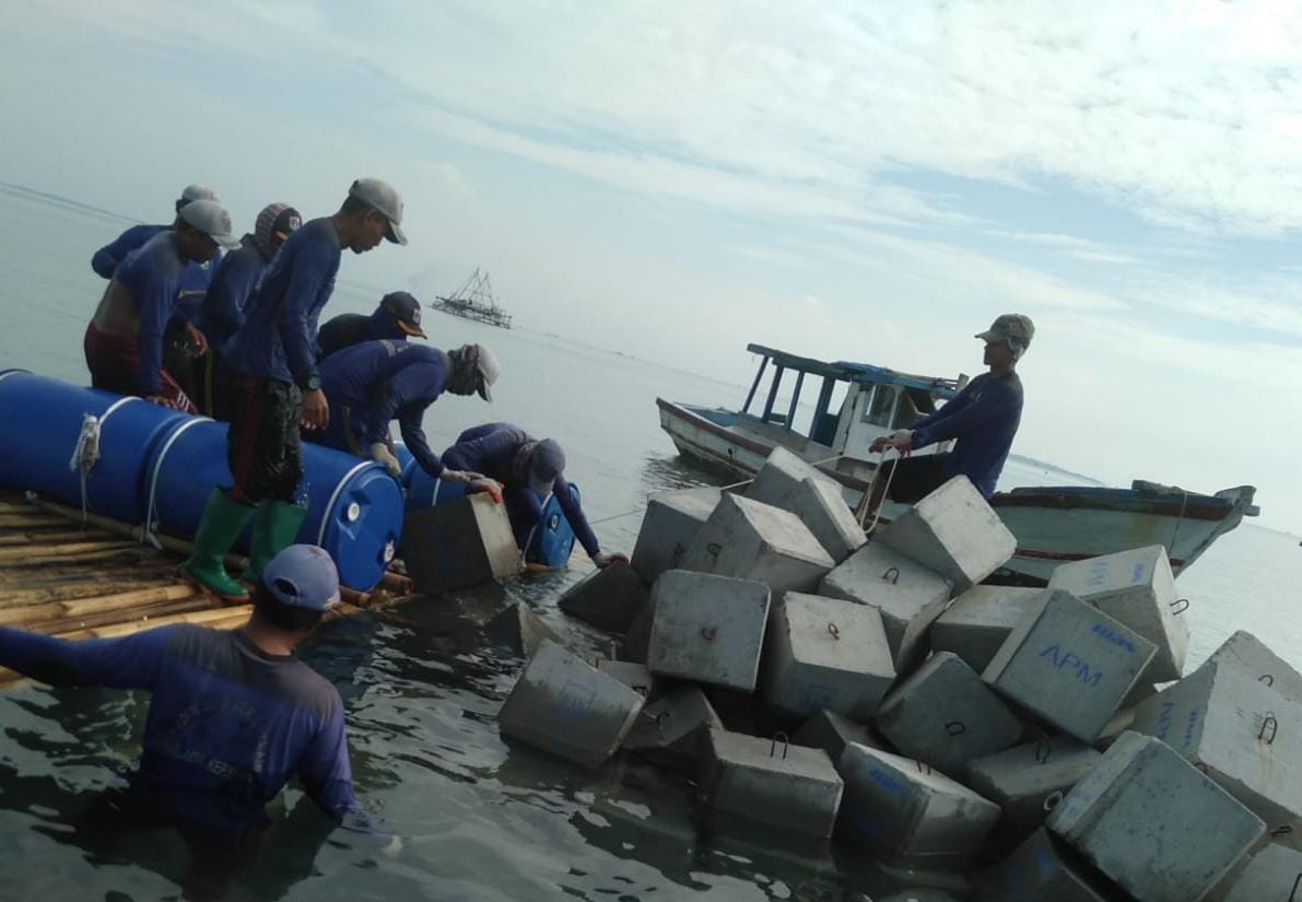 Petugas Suku Dinas Sumber Daya Air (Sudin SDA) Kepulauan Seribu, memasang kubus masif di pantai Gusung Klanceng sisi utara RT 01 RW 01 Pulau Lancan ..