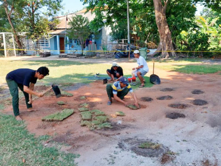 Dalam rangka menyambut HUT ke-496 Kota Jakarta, warga Pulau Untung Jawa, Kepulauan Seribu Selatan, bergotong royong menata lapangan sepak bola.