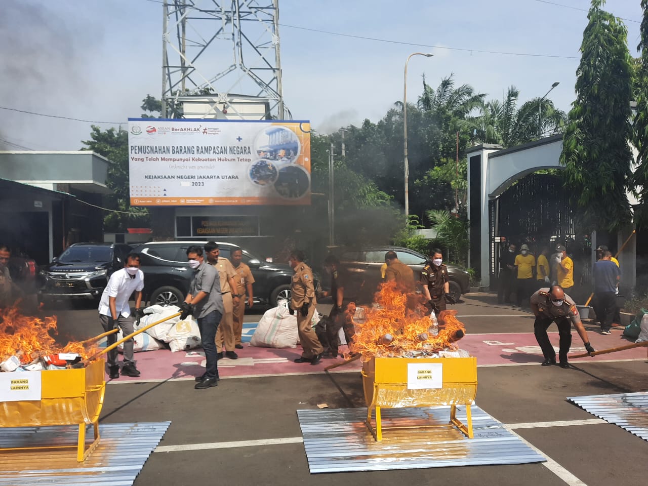 Bupati Kepulaun Seribu, Junaedi menghadiri pemusnahan barang rampasan negara di halaman Kantor Kejaksaan Negeri Jakarta Utara, Selasa (13/06/2023). ..