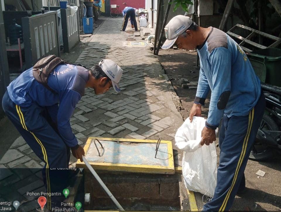 Petugas Sudin Sumber Daya Air (SDA) Kepulauan Seribu menguras bak kontrol di Kelurahan Pulau Untung Jawa, Kecamatan Kepulauan Seribu Selatan.