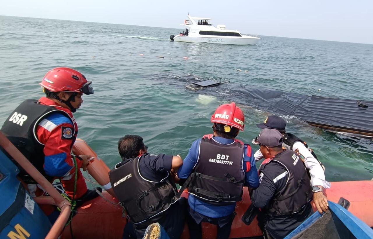 Petugas gabungan Kepulauan Seribu, berhasil mengevakuasi korban kapal karam di perairan Pulau Bokor, Kelurahan Pulau Pari, Kecamatan Kepulauan Seri ..